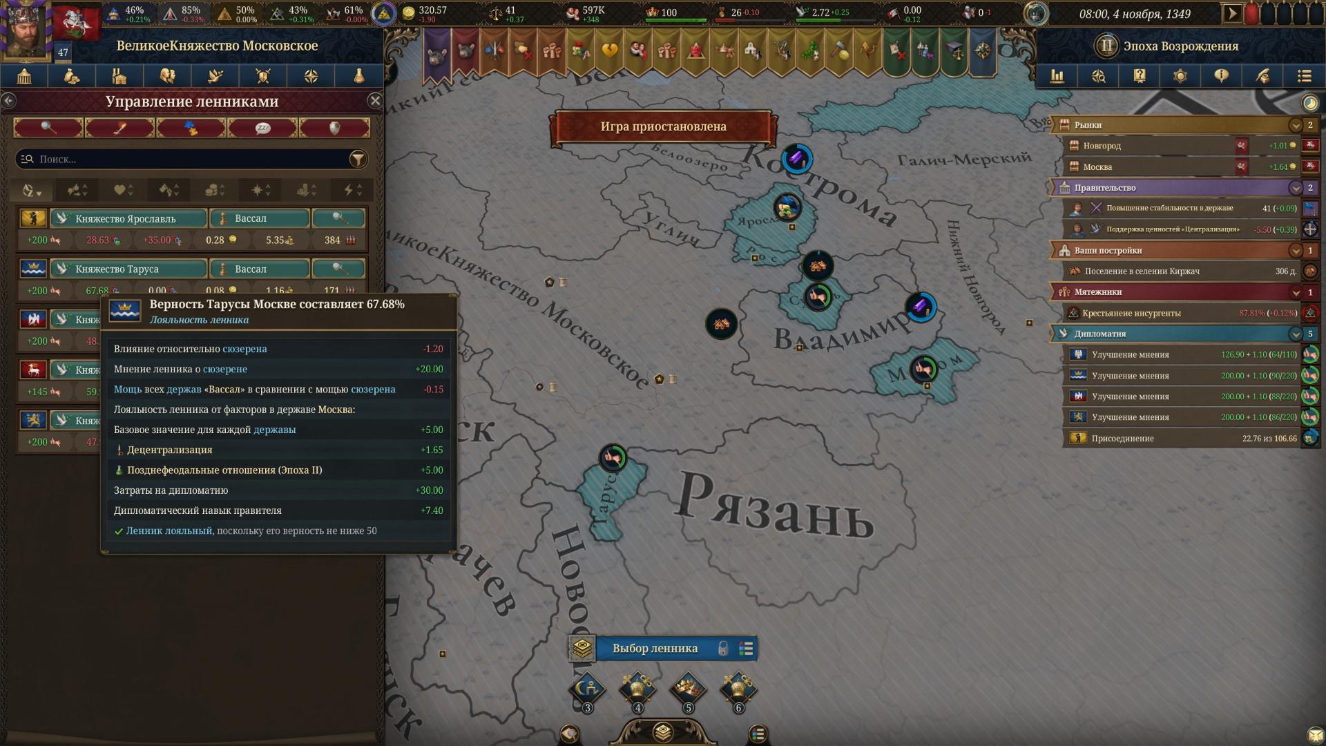 Всётаки стало интересно и посмотрел. Люди говорят про всякие там централизации/децентрализации, а я скажу, что и без централизации вассалы стали почти нелояльны при норм скиле правителя и полностью выкрученом ползунке затрат на дипломатию и отношениях в 200. Пример от 2-х провинчатой тарусы - она имеет аж 67 лояльности (кстати на 5 уменьшили бонус за тех второй эпохи до 5, вместо 10). Какой-то максимально паршивый баланс -