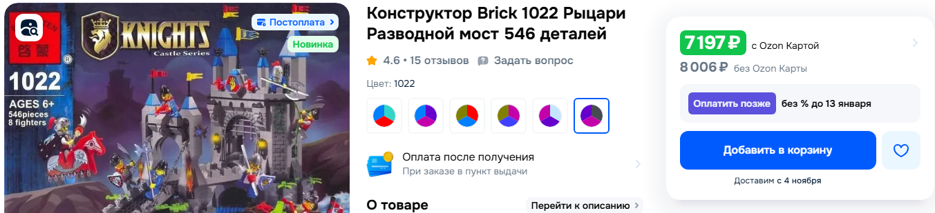 Интересное наблюдение - LEGO наборы 90х-начала 00х, особенно легендарных серий (Castle, Pirate, Star Wars, Racers связанных с Ф1 и еще ряд тематических) взлетели в цене и несобранные продаются от 10 000 даже за небольшие наборы, а даже собранные от 5 000 начинаются. Цены могут спокойно до 200 000 р. доходить. И этот рост цен на наборы, которые давно не производятся привел к парадоксальной ситуации: Enlighten Bricks, собственно китайские подделки LEGO, их наборы из 00х по сериям Castle/Knights и Pirates тоже взлетели в цене. Тот же замок от Enlighten уже стоит новый около 10к, когда в свое время они в магазинчиках 1000 стоили от силы. Вот теперь езжу когда куда-то по делам, ищу все возможные магазины игрушек в округе (желательно чем меньше тем лучше) и канцтоваров, в поисках Enlighten. Прикол в том, что их LEGO в итоге все же прикрыли в году 15м примерно, поэтому эти наборы тоже давным давно не выпускается. Сейчас эта фирма стала Q-Man и ссориться с LEGO больше не хочет, наборы делает свои и даже дизайн минифигурок поменяли. Вообщем ищу, пока видел кучу наборов как раз 13х-15х годов в таких магазинчиков в основном на военную тему, сорвать куш пока не получается( Зато в ходе поисков нашел тоже раритетный набор Lepin: Прикол в том что это полная копия набора LEGO Speed Champions 75879 Scuderia Ferrari SF16-H, даже все наклейки не пиратские а с настоящими спонсорами. Такой оригинал стоит около 5000, копия около 1500-1800, я урвал за 800 рублей. Доволен, хотел оставить в коробке запечатанным на память, но все же переборол себя и собрал, теперь коллекция стала немного ретро) Еще копится полибеги, их уже 7, потом как соберу все желаемые полибеги скину обзор их коллекции. А что касаемы темы сообщения - поиски буду продолжать. Если увидите любые средние и большие наборы Enlighten Brick по Castle/Knights и Pirates по низкой цене берите, точно передадите дороже. Маленьких пока много на маркетплейсах, чисто если как ностальгию взять) Просто для примера, довольно поздний набор Enlighten (выпущен в 13м году):