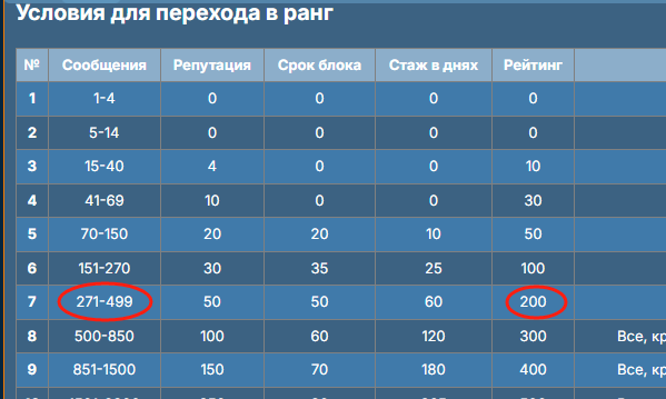 Согласно таблице https://www.strategium.ru/forum/tables.php#Условия_для_перехода и судя по вашему количеству сообщений, вы сейчас должны ориентироваться на 7 ранг, зацените: Но для его получения вам сейчас не хватает 200-70 = 130 единиц рейтинга. Вы его (рейтинг) можете накачать, продолжая писать сообщения, либо просто купив его у себя в профиле.