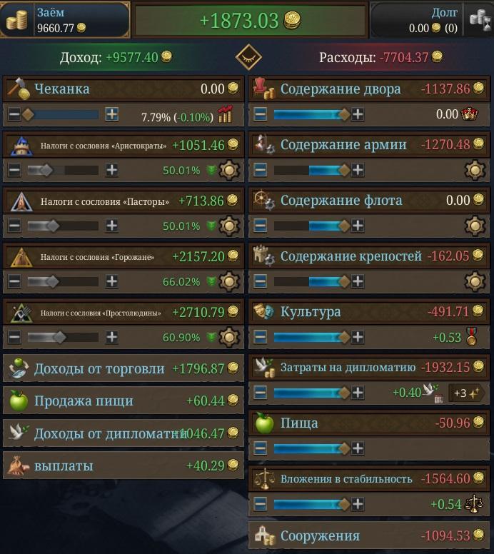И каждый домик дает тебе деньги с этого увеличения, если налоги достаточные, то больше, чем от него растут расходы. При эффективных налогах не важно сколько дает домик, 10, 100 или 1000, ты в любом случае будешь получать больше, чем увеличиваются траты. А возить между своими рынками самому... Пусть горожане возят, они вполне справляются. Я сейчас прошел стадию традиционной экономики, безостановочно застраиваю города производствами. Доходы растут даже при полных расходах на все, да, на скрине у меня уже максимальная легитимность, значит ползунок потребует только половину расходов, но базовая стоимость двора у меня 22%, потому что топ1-вд и 3 гегемонии. Как видно, доходы от дипломатии меньше моего общего дохода считай в два раза. Я при этом не чеканю деньги, ибо до этого сидел на печати денег, чтобы побыстрее завершить "двор vs держава" кризис(просто закидывал сословия деньгами, чтобы отобрать привилегии, ушел в долг на 550к).