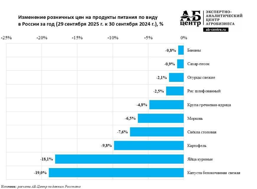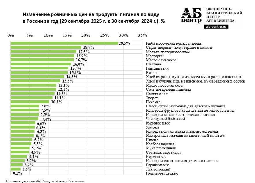 По итогам сентября перечень продуктов питания, дорожающих, год к году, выше уровня продовольственной инфляции не изменился. По-прежнему это рыба (+28,5%), молочные продукты (+11-19%), хлеб (+13-14%), говядина, подсолнечное масло, по данным АБ-Центра. Сохранился тот же перечень и дешевеющих продуктов, среди которых яйца и гречка (-4,8%). На гречку принято пристально обращать потому, что это индикатор состояния российского общества: россияне при первых признаках наступления кризиса почему-то первой начинают скупать гречку, и цены на неё начинают сильно расти. Сейчас, судя по динамике цен на гречку, россияне не ощущают кризиса. https://t.me/proeconomics/18056?single