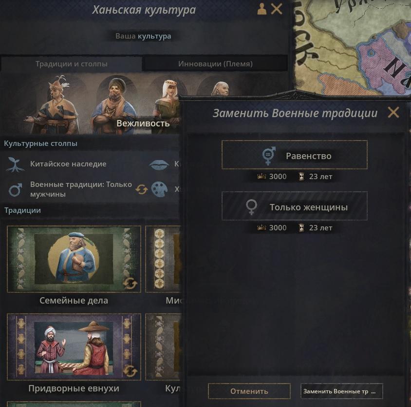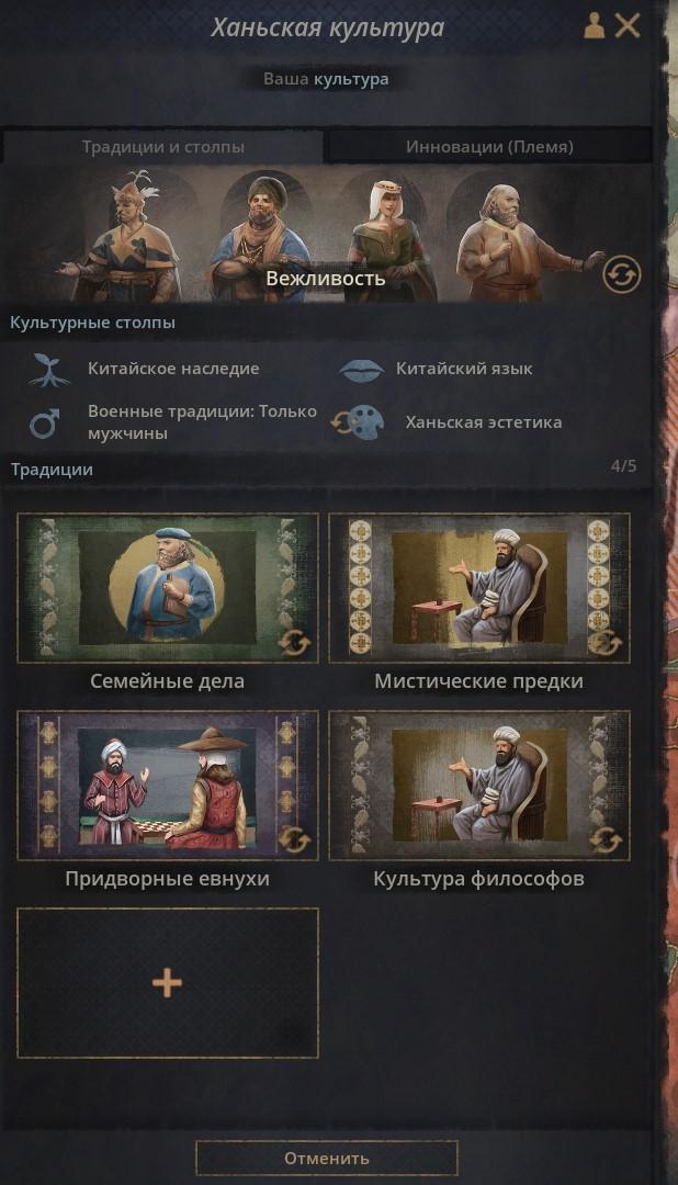 Это что за культурный столп? В державных есть "Равное наследование", но это решает лишь часть проблемы - после выбора этой традиции, нам придётся до самой примогенитуры лишать наследования не только лишних потомков-сыновей, но и дочерей. Эта культура как-бы для других целей. Или ты про иную?