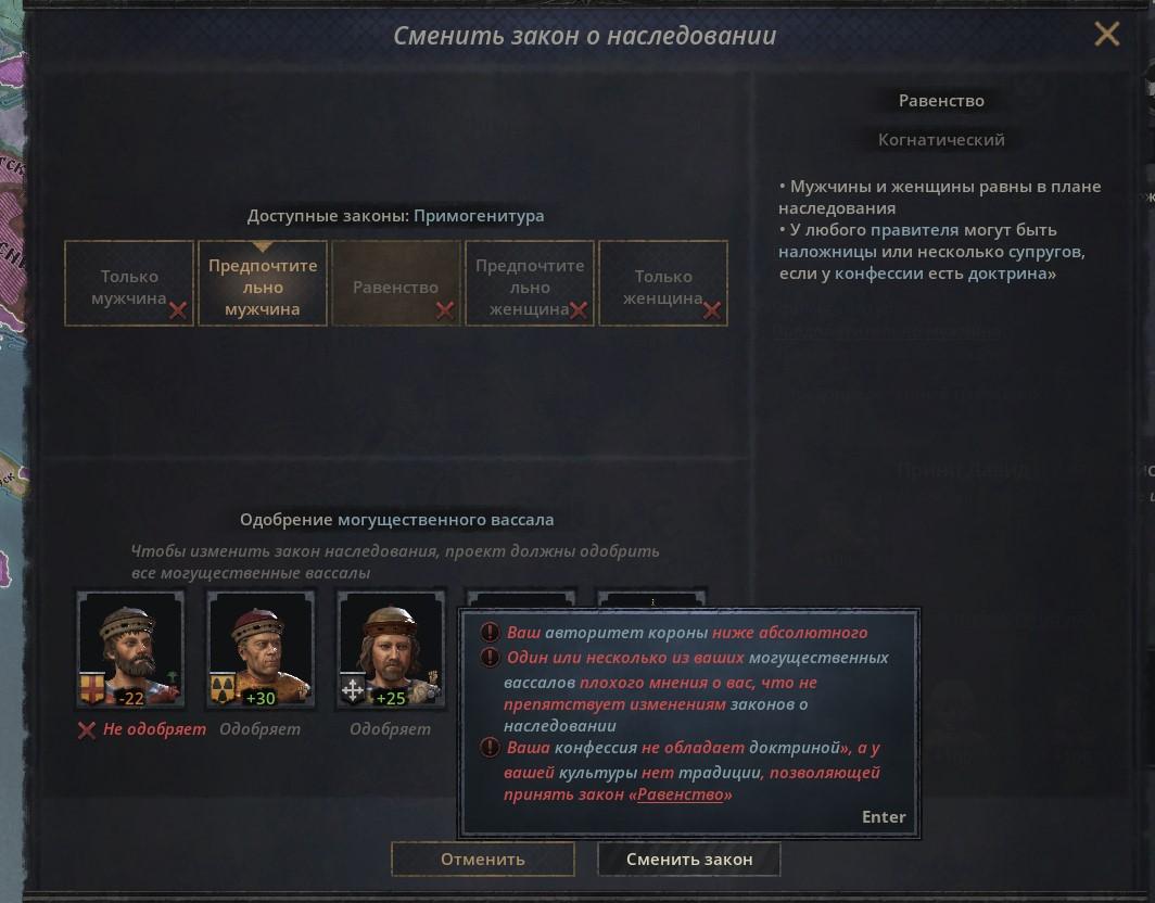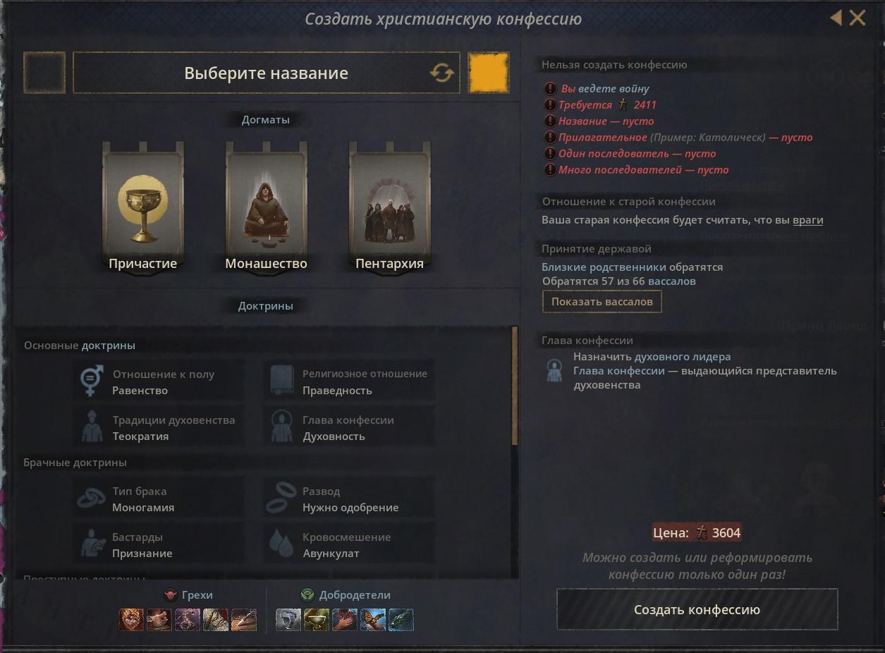 Ладно иду в законы наследования, что бы изменить там. Здесь уде больше препятствий, но ладно, авторитет я за сорок лет подниму, вассалов ублажу(или вырежу), а вот третий пункт меня смущает. нужно менять конфессию. Чудно.