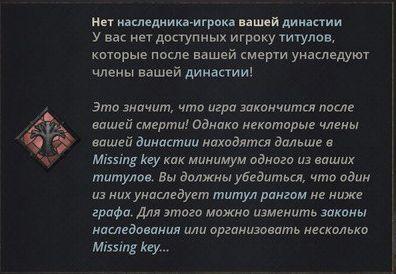 Возникла проблема с наследником. Не смог завести сыновей, осталась только дочка. Выскакивает подсказка, что игра закончиться, если что-то не предпринять. В подсказке баг, вместо каких-то терминов показываются некликабельные слова "Missing key". Подскажите, пожалуйста, что делать?