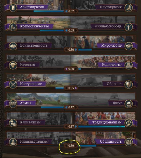 С ней всё так. Это другие пока забагованы. В актуальных правилах ценности максимально смещаются на стократное месячное значение. То есть если вы двигаетесь 0.12 к армии, вы можете максимально дойти до 12 армейских пунктов. Поэтому при достижении максимального значения кнопки должны прекратить подсвечивать смещение.