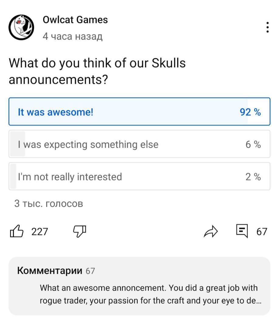 Что думают люди о новых анонсах Совокотов на Warhammer Skulls. Такие же результаты и от наших. И никакие Unity тому не помеха, ибо народ знает, что разработчики выдают отличные продукты, а Rogue Trader по атмосфере, деталям и духу очень классно передали вселенную.