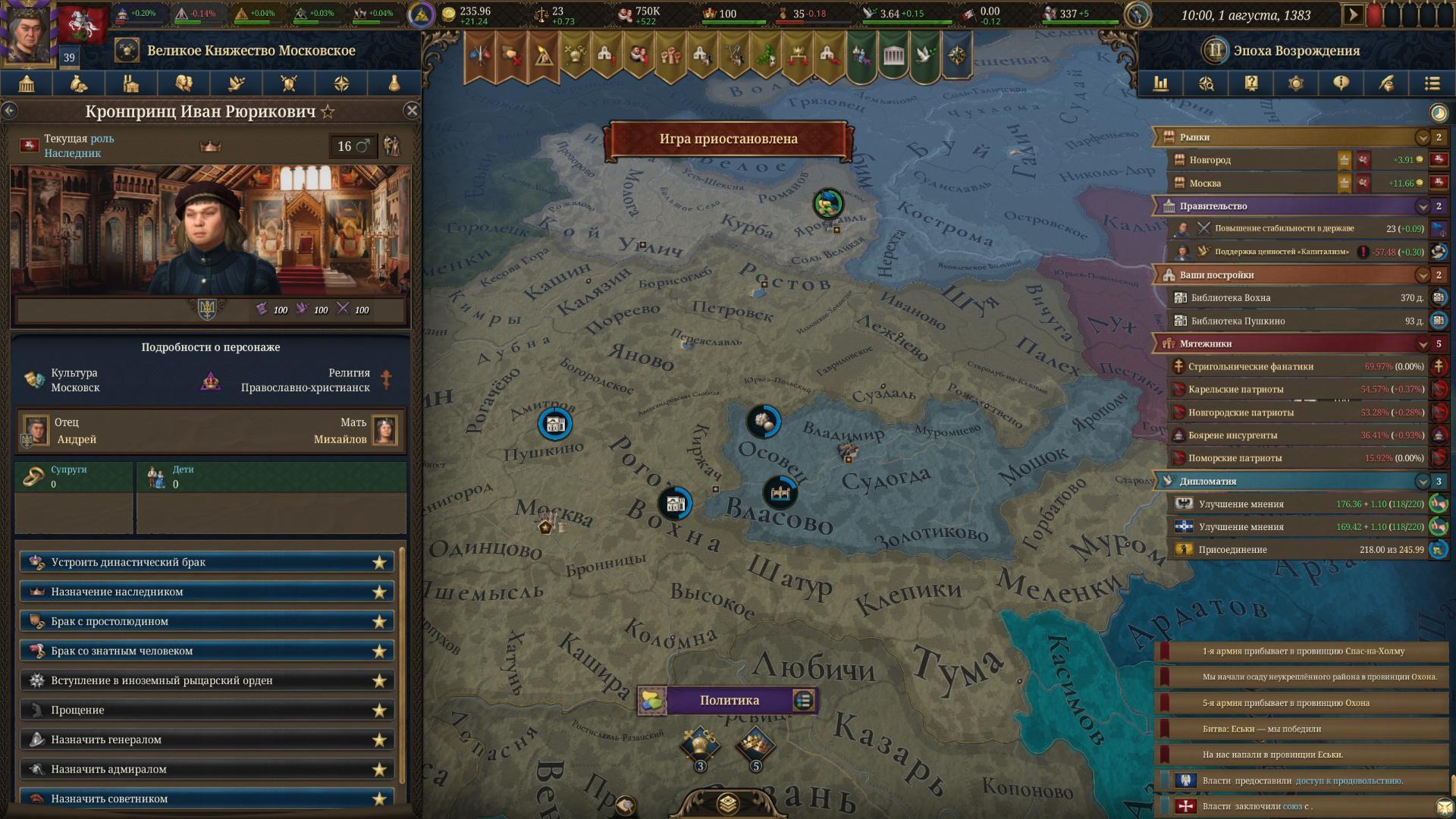 поиграл 4 часа, впечатление просто отвратительные. Начал за Москву, сразу взял Ярославль, Ростов и Муром в Вассалы, пока не нашел вкладку с вассалами, ориентироваться ужасно неудобно. Клаймов у М