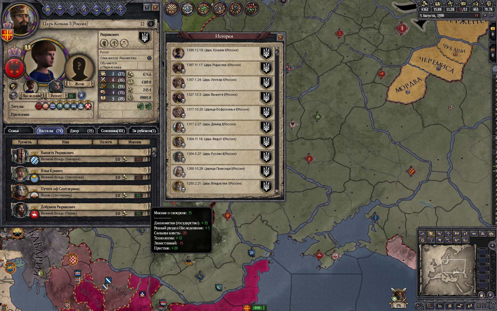 уже восьмой год какой-то младенец из Рюриковичей. 7й уровень дворянских традиций и легализма в Киеве, а также сверхвысокий престиж династии по +20 отношений от престижа с рождения - решают. Если и случаются смены правителя, то очень быстрые, дворцовым переворотом по требованию фракции. Малолетний Козьма, не пытающийся вводить абсолютную власть короны - пока почти всех устраивает (на скрине по возрастанию отношений, из 74 вассалов только двое недовольны)