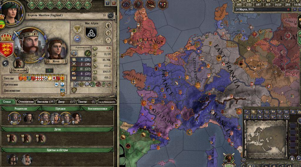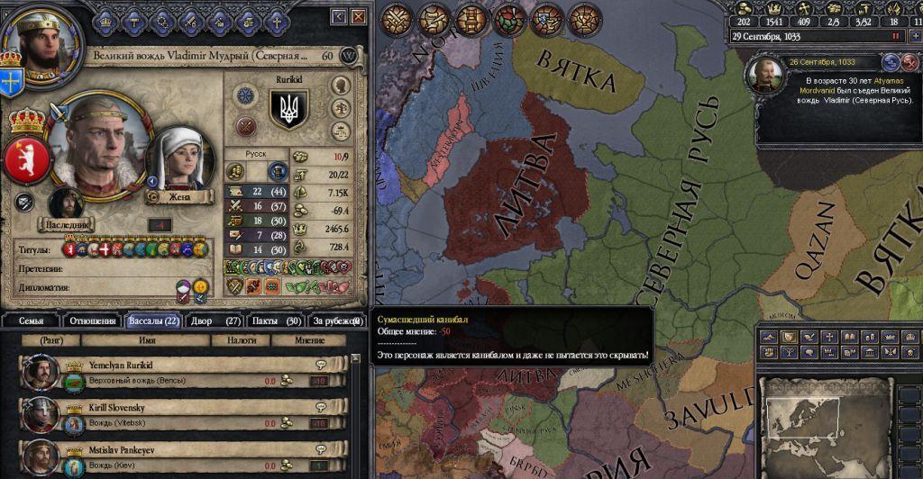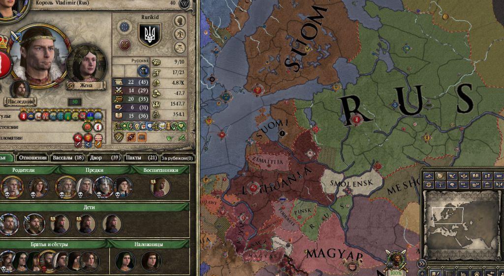 Праправнук Рюрика, Правнук Олега и даже внук Игоря! Осталось совсем чуть-чуть чтобы забрать Киев и принять православие от разросшейся Византии-Болгарии (пока Аббасиды заняты - Византия на дрожжах). Впервые вижу, что ИИ рюриковичи таки берут Киев, вечно там печенеги-мадьяры и прочие ляхи шатаются. И впервые так исторично для Руси у компьютера получается (ну, если не считать королевств Литвы и Финляндии под боком). Правда эт только на востоке. На западе как обычно жуть.