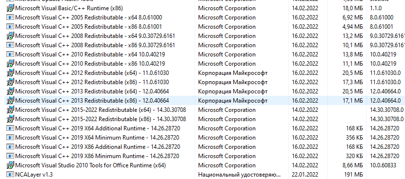 переустановил библиотеки по вашим версиям, только не нашел 2015-2019 их убрали из загрузок, у меня установлено 2015-2022. Не запускается.... вообще злое колдунство.