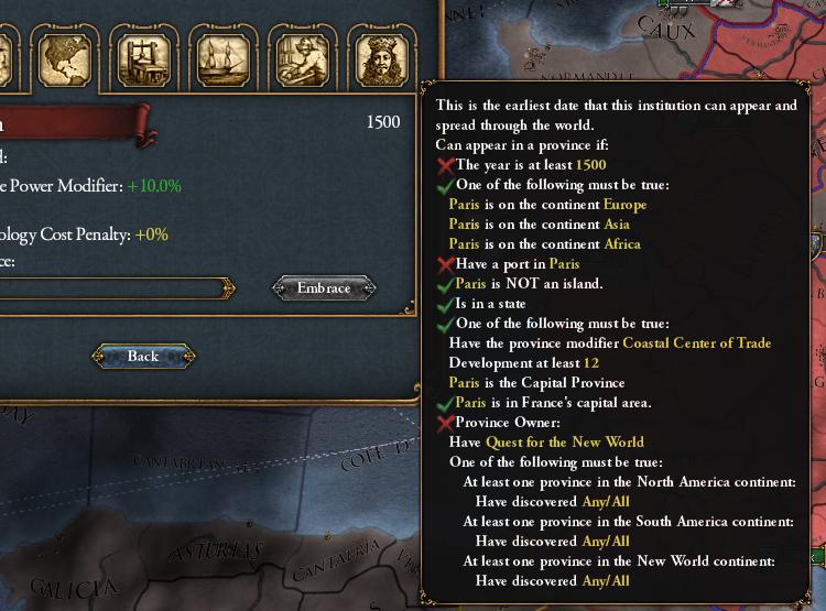 Под "как правило там" я и  имел ввиду конечно Кастилию и Португалию имеющими выход к океану, как правило они и бывают самыми (а порой единственными кроме игрока) колонизаторами к 1500 году, захватывая те области я тем самым выбиваю их из колонизаторский гонки и становлюсь монополистом на возникновение в моих землях этого института, и уж не знаю по случайности или как, но опять колониальный институт возник в Севилье уже французской Севилье, хотя Франция имеет много других замечательных портов.