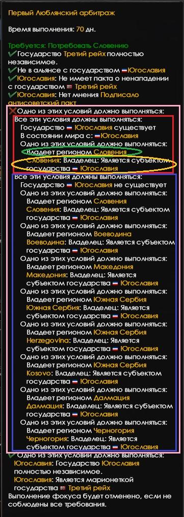 1) Как работает фокус "1-й Люблянский арбитраж"? Югославия существует, войны с ней нет, Словения в ее составе, а условие не засчитывается, поэтому фокус нельзя активировать. Или владеть Словенией должна Германия? Тогда как остаться в мире с Югославией...:mega_shock: