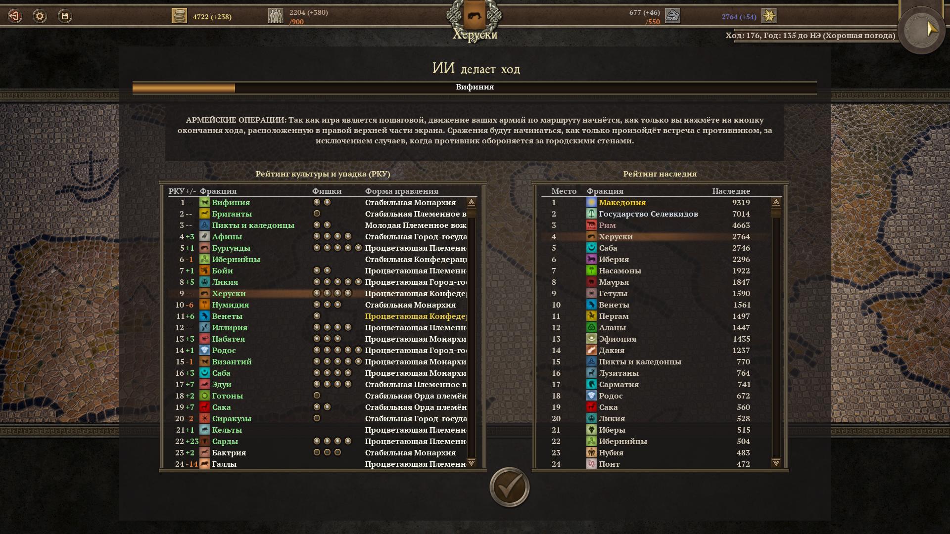176 ход. Херуски взобрались на 4-ое место в рейтинге наследия стран. В тройке лидеров - Македония, Государство Селевкидов и Рим.