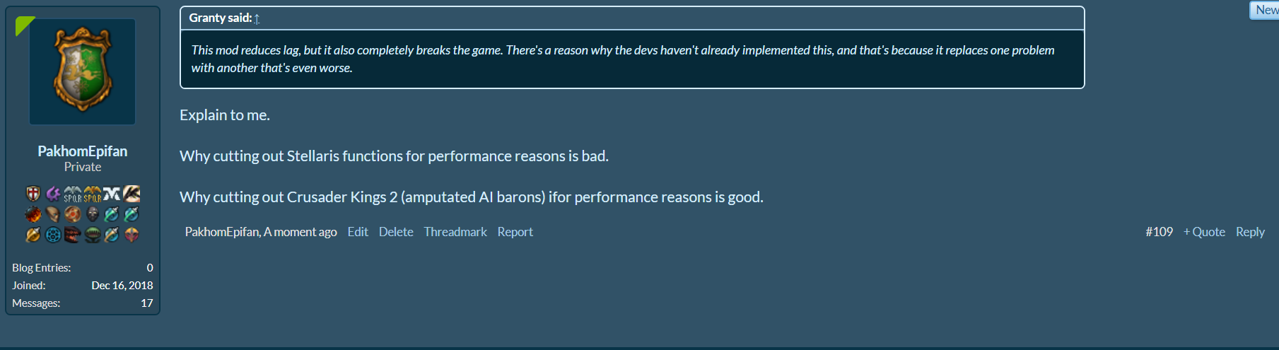Одно из основных причин многих споров в обсуждении Стеллариса - это то, что когда оба говорят "игра лагает" один понимает как малейшие снижение скорости, то другой называет лагами когда игра делает т