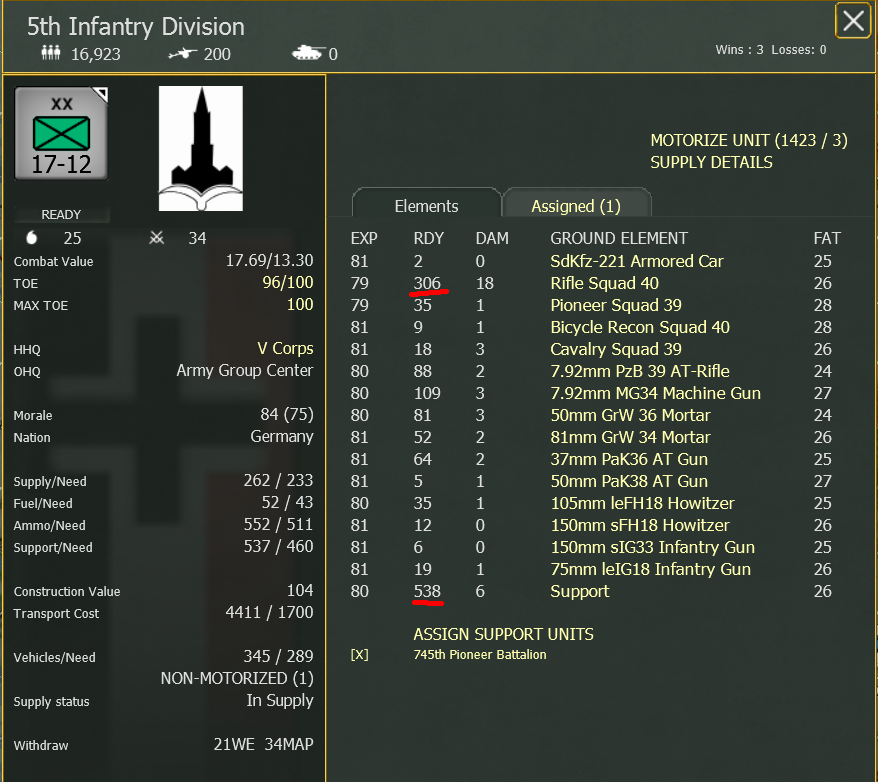Тогда, следуя используемой игровой логике, у наших штабы должны быть более многочисленные. Ведь, с учётом постоянной недоукомплектованности боевого элемента войск с середины войны, по существу наш стрелковый корпус равнялся пехотной дивизии вермахта, а советская армия соответствовала армейскому корпусу дойчландов. Некое превышение общей численности "по головам (едокам)" как раз и происходила от извечного раздувания тылов, по многим причинам свойственного как Русской Императорской, так и Советской Армиям.