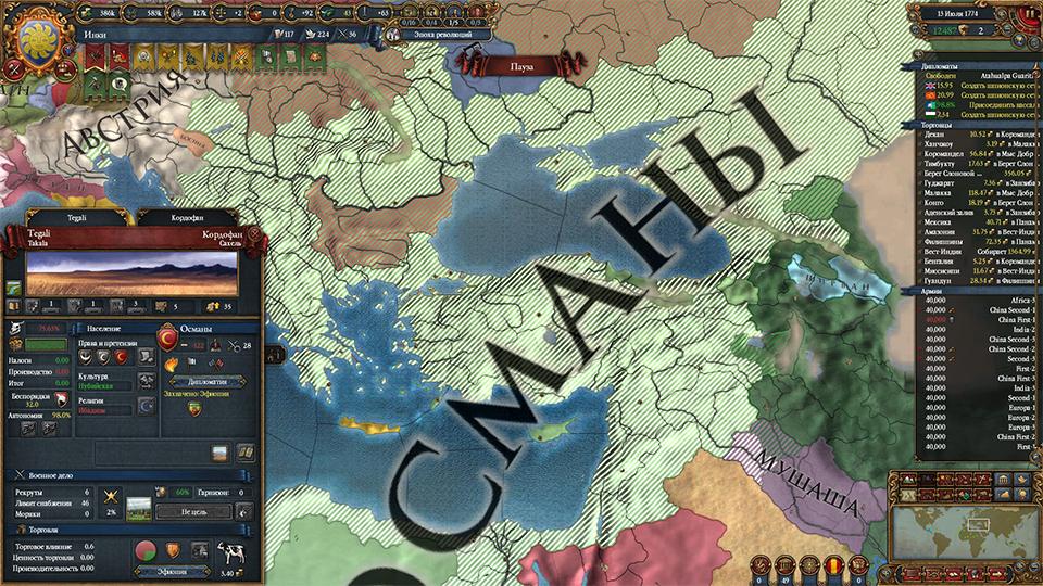 PSS: А насчет автономии 100 и опустошению 100 по всем территории турка, я уже и сам разобрался (почти). Автономии 100% нет в тех провках где нет рисков восстания националистов (таких мало, но они существуют), а значит это турок сам поднял автономию для снижения риска восстаний и развала страны. А опустошение 100% потому что оккупация увеличивает опустошение на 0,2 в месяц... правда по всем расчетам за 15 лет должно быть 36 опустошения, а ни как не 90-100 во ВСЕХ провках, причём на момент начала всей этой заварухи у турка не было таких опустошений. И даже когда я его полностью оккупировал я оставлял в его столице армию (чтоб крестьяне не перезахватили) и надеялся что те там опустошат ему провку до конца, но этого не произошло, я специально наблюдал за этим, а потом и мир подписал. Что там наделала такого Австрийская коалиция не знаю, но наверное всё-таки это результат бедствий, просто, не совсем в курсе какие от бедствий негативные эффекты. Ну это и не так важно. Вся страна у него -100 опустошения. Впринципе развалить не смогли, но уничтожили экономически. Страна руина.